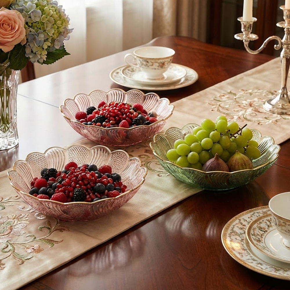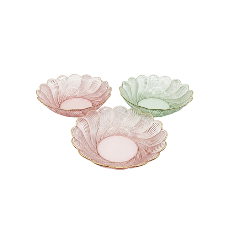 Eleva la presentación de tus platos o la decoración de tu hogar con este precioso cuenco de cristal, inspirado en el diseño clásico de vidrio prensado. Cada pieza presenta una intrincada textura exterior y un elegante borde ondulado tipo pétalo, rematado con un filo dorado brillante que captura la luz maravillosamente.
