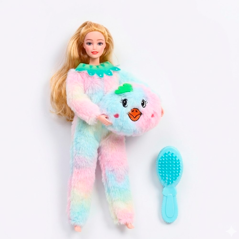 ¡Prepárate para una dosis extra de ternura! Esta preciosa muñeca fashion está lista para acurrucarse y jugar. Luce una increíble y larga cabellera rubia perfecta para peinar y viene vestida para la ocasión con un mono (onesie) súper esponjoso con un precioso estampado tie-dye en colores pastel suaves (rosa, azul, amarillo y menta).