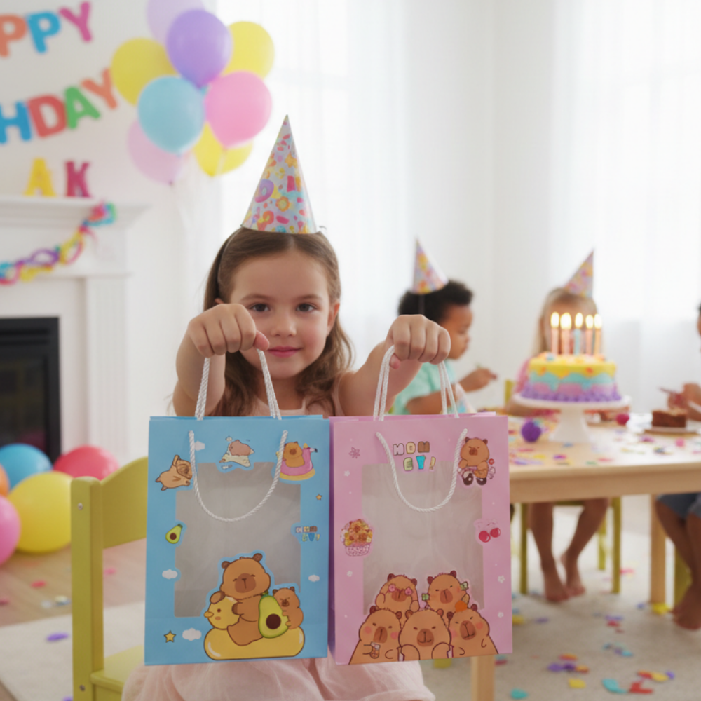 Bolsa de Regalo para Cumpleaños con Diseño Capybara es perfecta para sorprender con un estilo tierno y divertido. Su ilustración de capybara le da un toque encantador que la hace ideal para regalos infantiles, juveniles o para los amantes de estos adorables personajes.