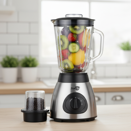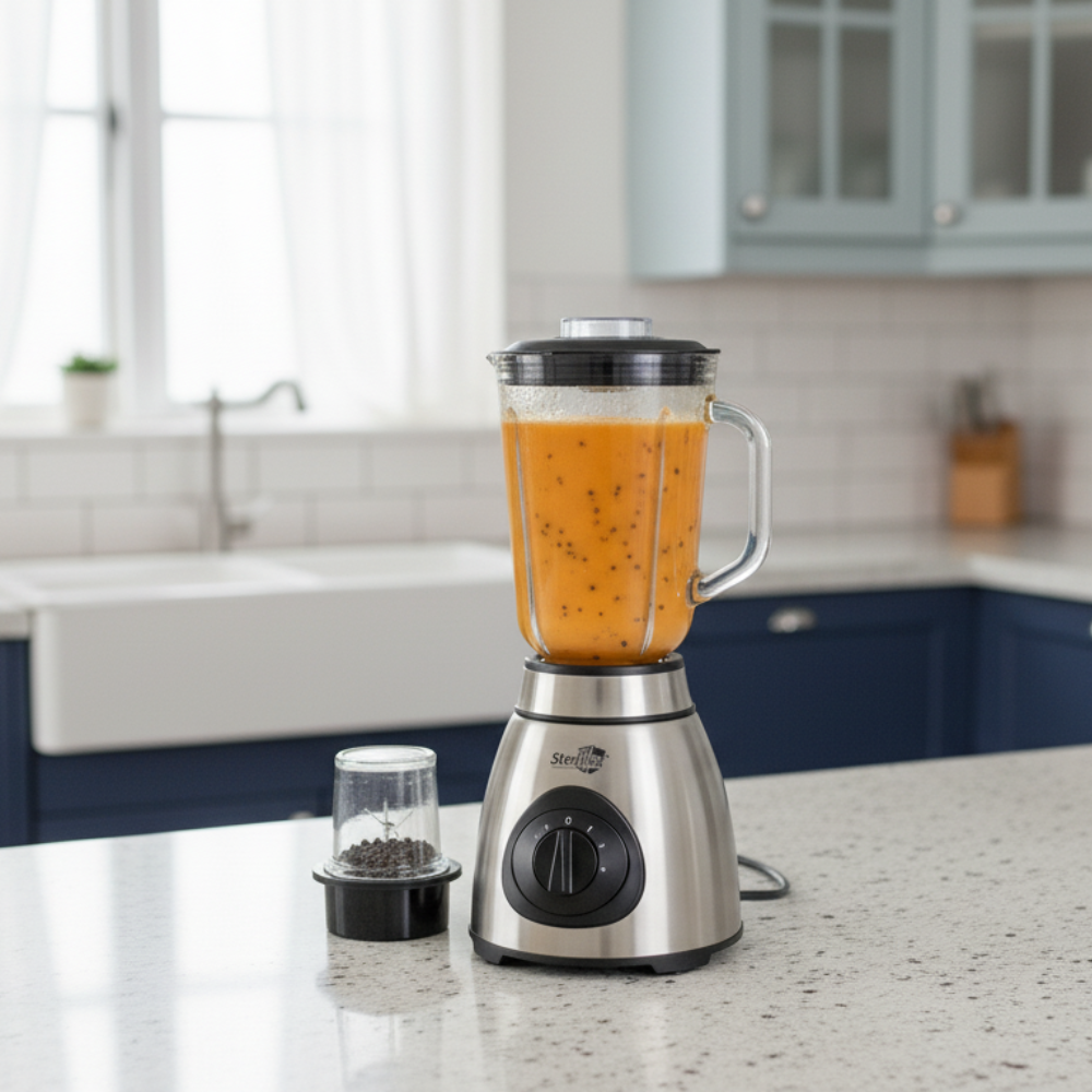 Prepara tus bebidas y recetas favoritas con esta potente licuadora multifuncional. Su vaso de 1.5 litros te permite mezclar grandes cantidades con facilidad, mientras que su accesorio triturador de café y granos añade versatilidad a tu cocina. Ideal para batidos, salsas, jugos y más.