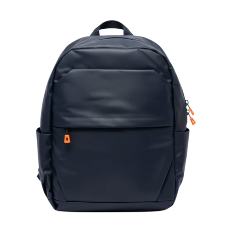 Mochila urbana de diseño minimalista en color negro mate, confeccionada con material resistente y de acabado impermeable. Cuenta con un compartimento principal amplio, bolsillo frontal con solapa diagonal y tiradores en color naranja que aportan un toque moderno y distintivo. Incluye bolsillos laterales para botellas u objetos pequeños y correas acolchadas ajustables que brindan mayor comodidad.