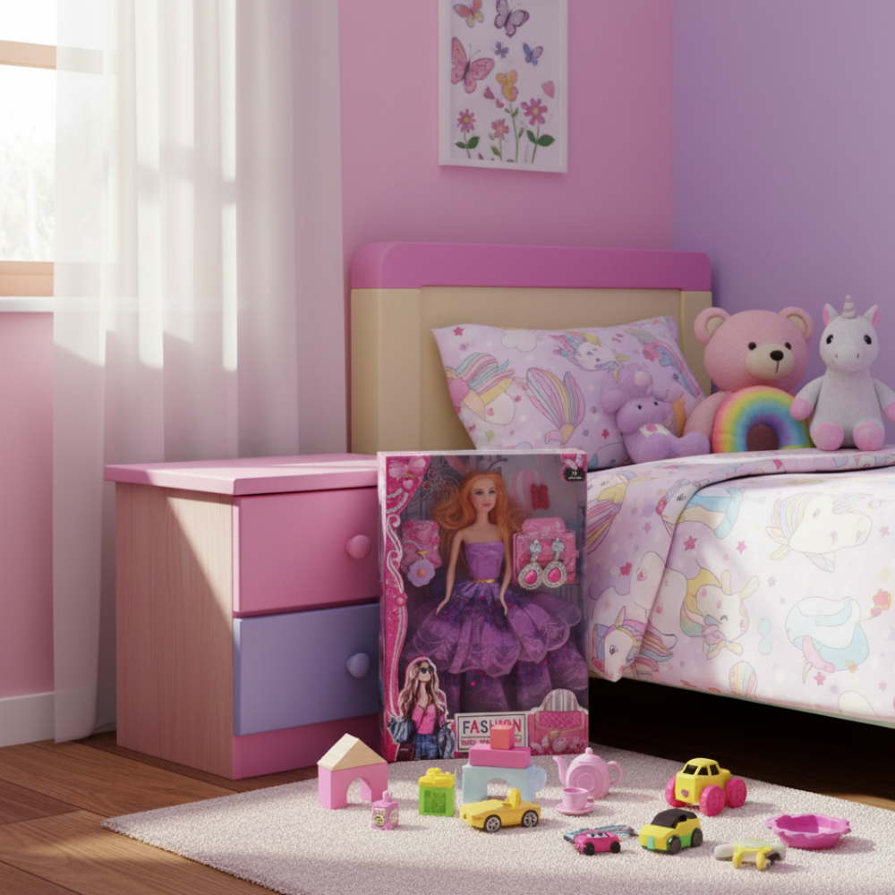Hermosa muñeca con vestido largo, ideal para regalar y estimular el juego creativo. Su diseño elegante y detalles cuidados la convierten en una opción perfecta para niñas que disfrutan de historias, moda y diversión. Fabricada con materiales resistentes y seguros, es ideal para horas de juego y también para colección.
