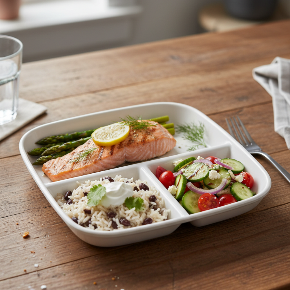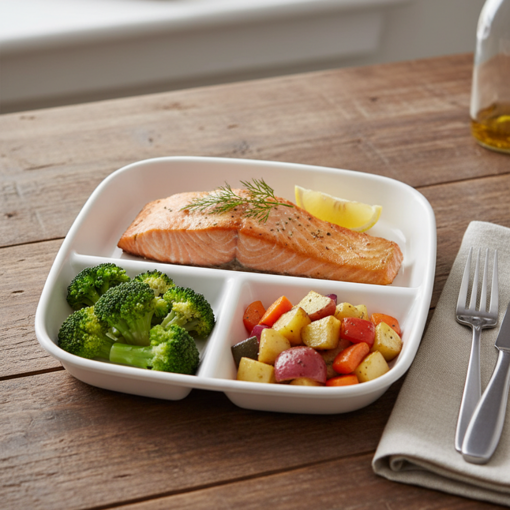 Mantén la presentación y el orden en tus comidas con el Plato de Porcelana con División. Su diseño con compartimentos te permite separar los alimentos sin que se mezclen, ideal para servir menús balanceados y completos.