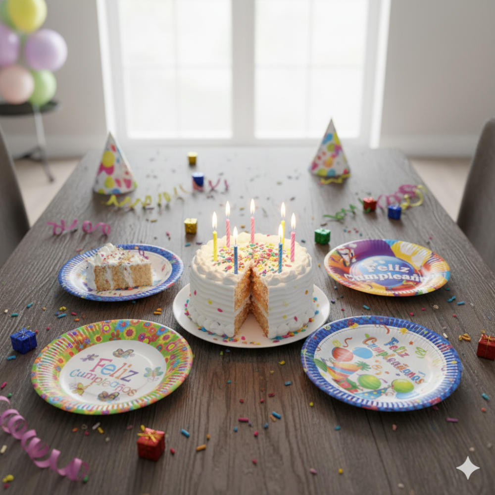 Los platos de diseño “Feliz Cumpleaños” son el complemento perfecto para celebrar con estilo y alegría. Fabricados con materiales resistentes y seguros para alimentos, presentan un diseño festivo que llena la mesa de color y diversión.