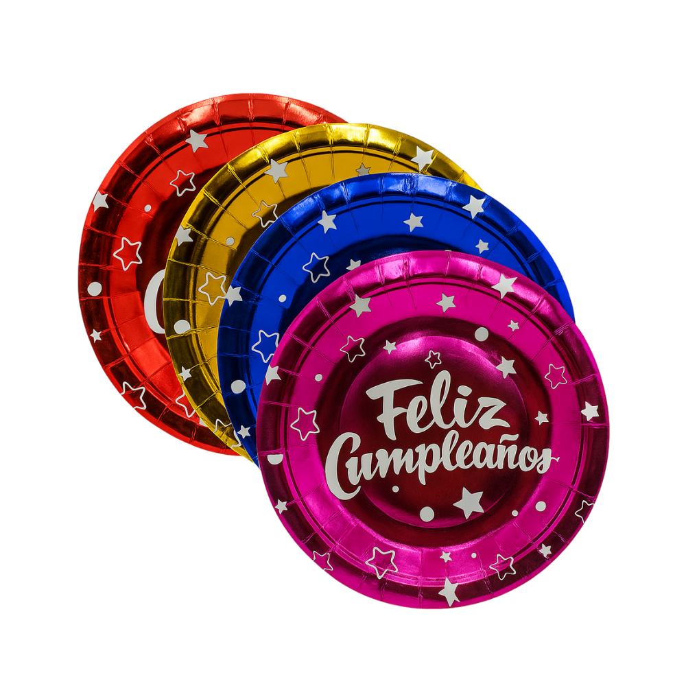 Celebra con estilo con nuestros platos de cumpleaños “Feliz Cumpleaños”. Fabricados con material resistente y acabado metálico brillante, estos platos añaden un toque festivo y elegante a cualquier mesa. Disponibles en colores vibrantes como fucsia, azul, dorado y rojo, decorados con estrellas y detalles brillantes que destacan en cada celebración. Perfectos para fiestas infantiles, reuniones familiares o eventos temáticos.