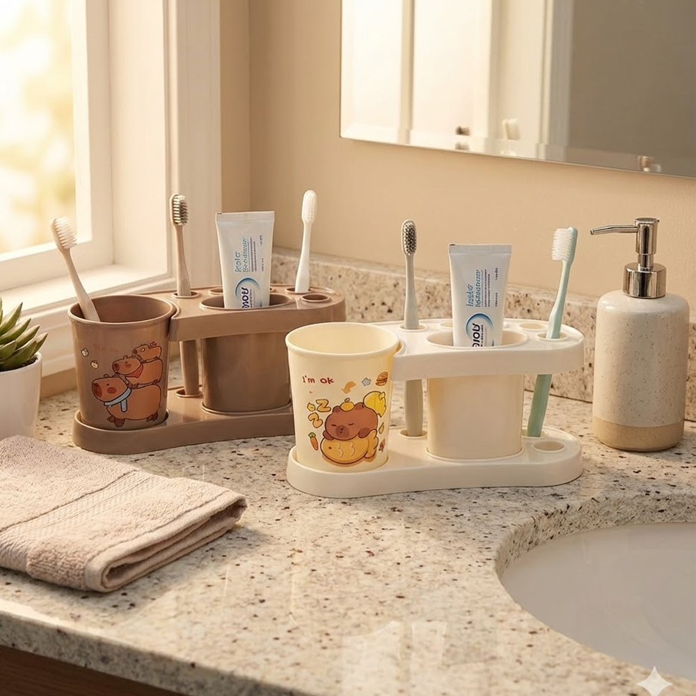 Haz que la rutina de higiene diaria sea más divertida y organizada con este práctico set de baño. Fabricado en plástico resistente y fácil de limpiar, este conjunto es perfecto para baños infantiles o para cualquier persona que ame los detalles tiernos.