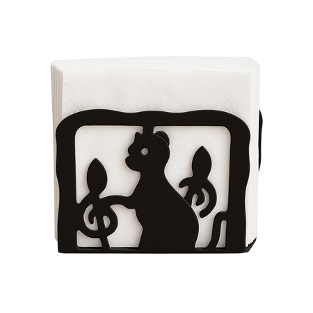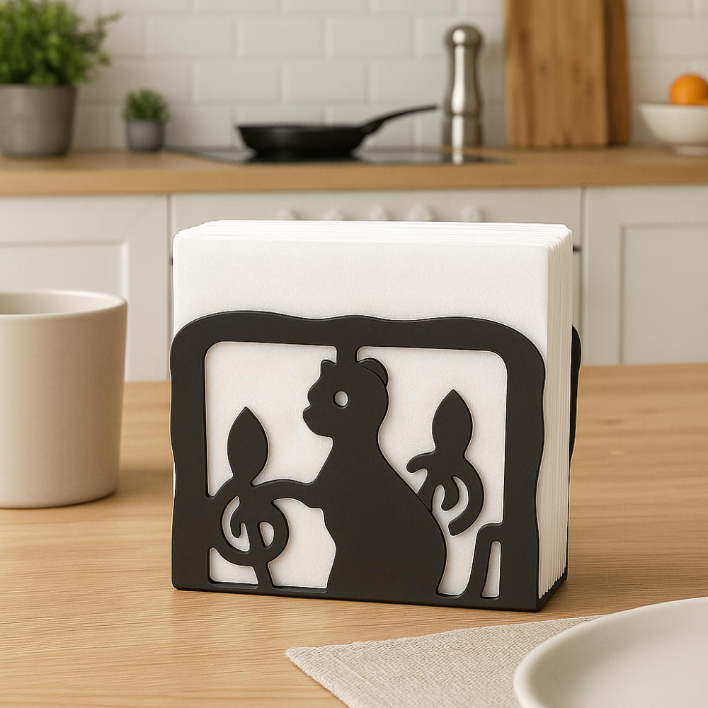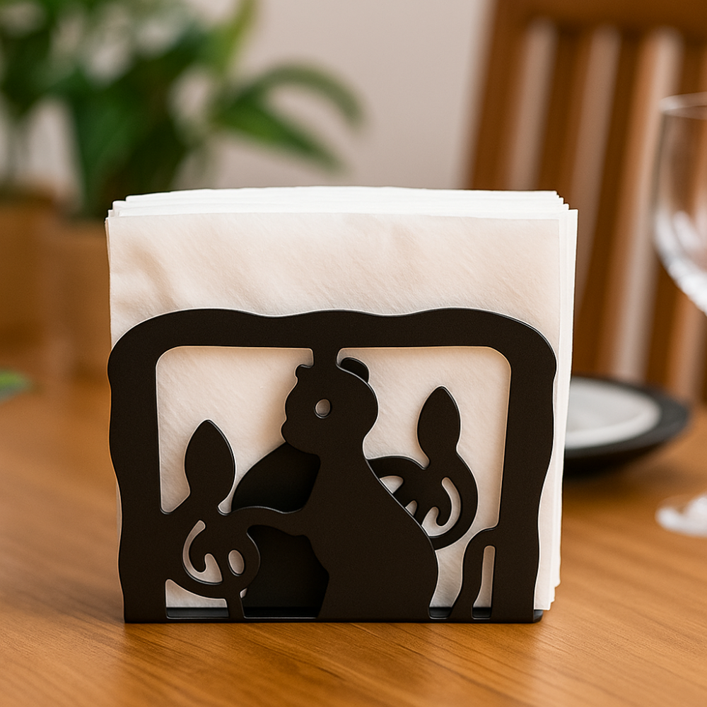 Servilletero de metal negro, con un diseño decorativo de silueta de gato rodeado de plantas, se presenta elegantemente sobre una mesa de cocina de madera clara. Su estructura sostiene un paquete de servilletas blancas que contrastan con el acabado oscuro del metal, resaltando el diseño lúdico y moderno.