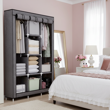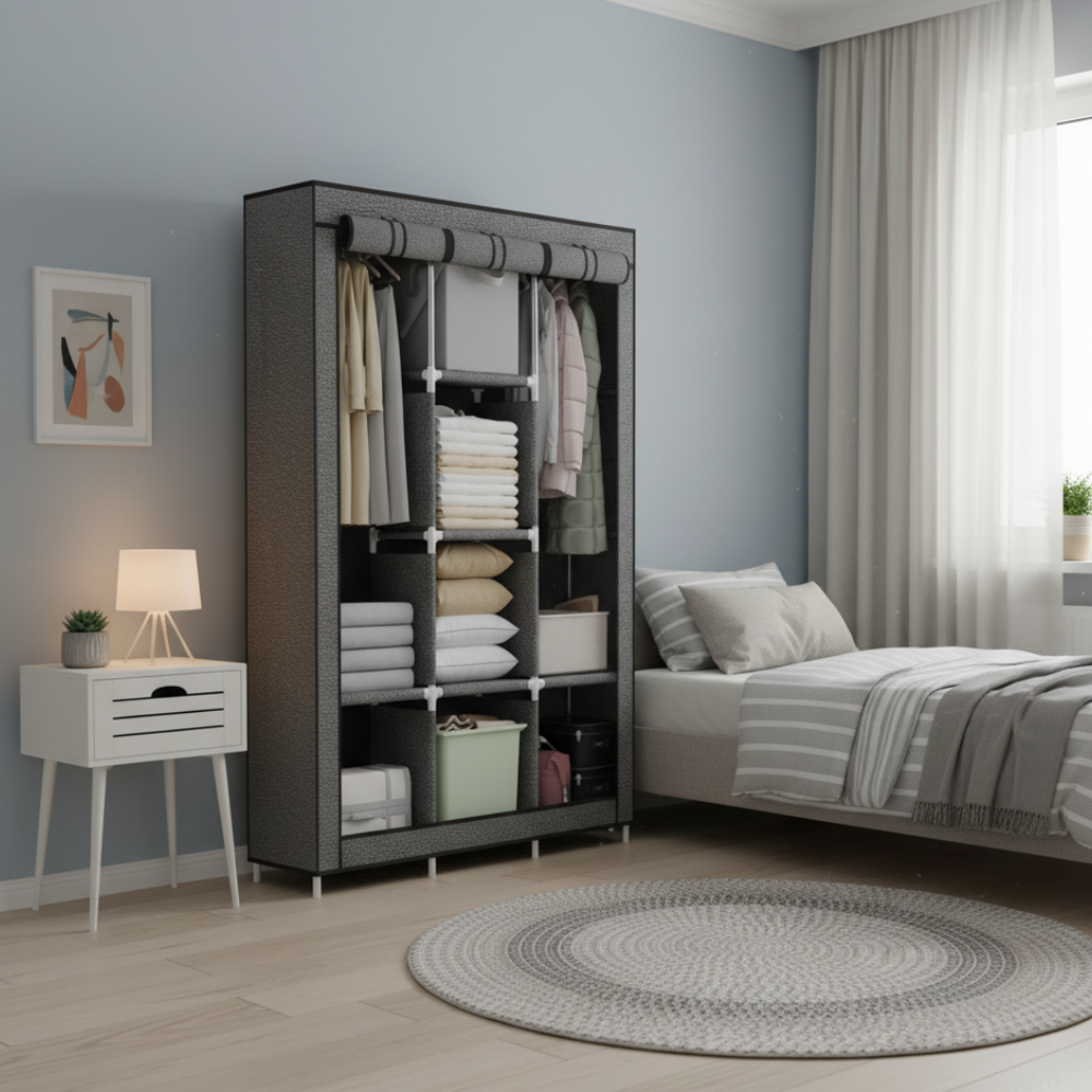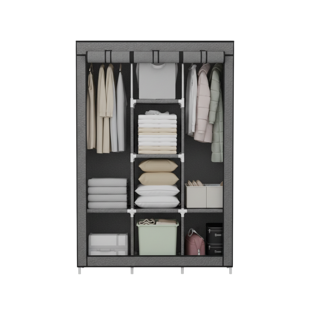 Fabricado con materiales resistentes y de fácil mantenimiento, ofrece estabilidad y durabilidad para el uso diario. Su diseño funcional incluye repisas, barra para colgar y espacios versátiles que se adaptan a distintos tipos de prendas.