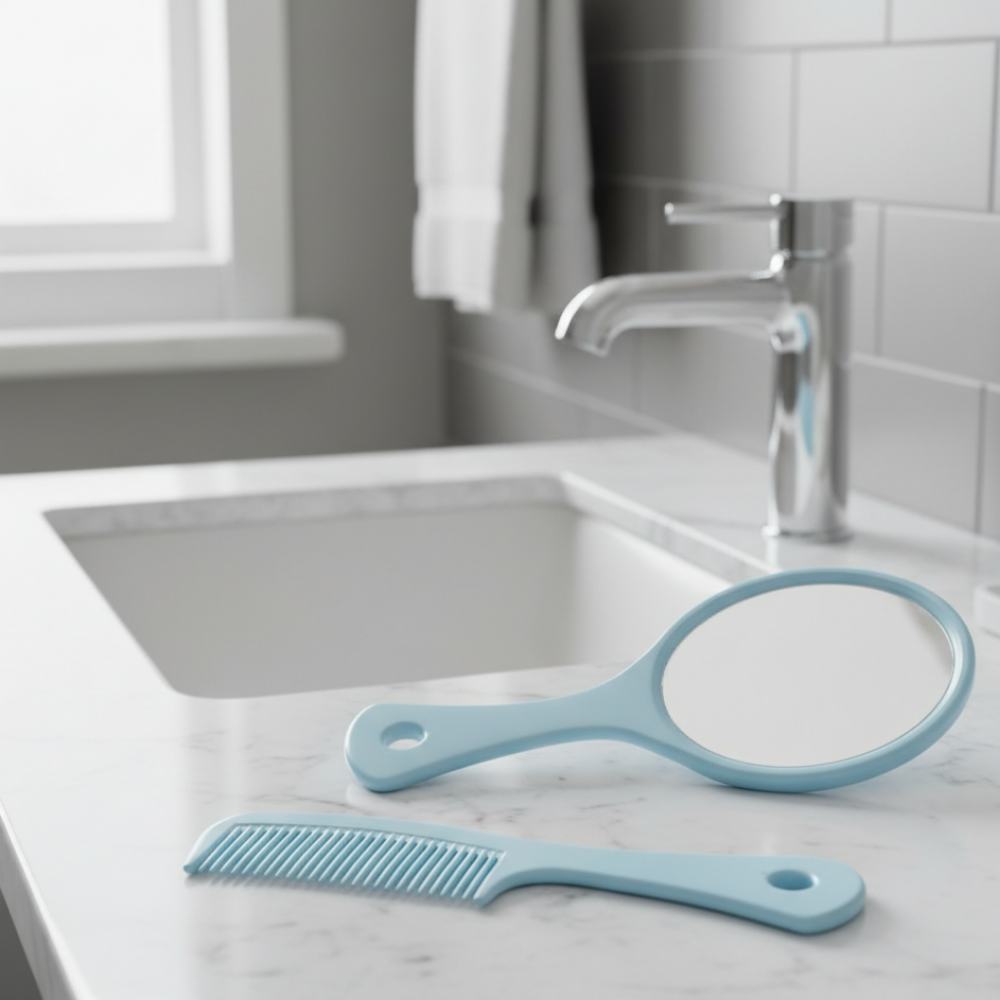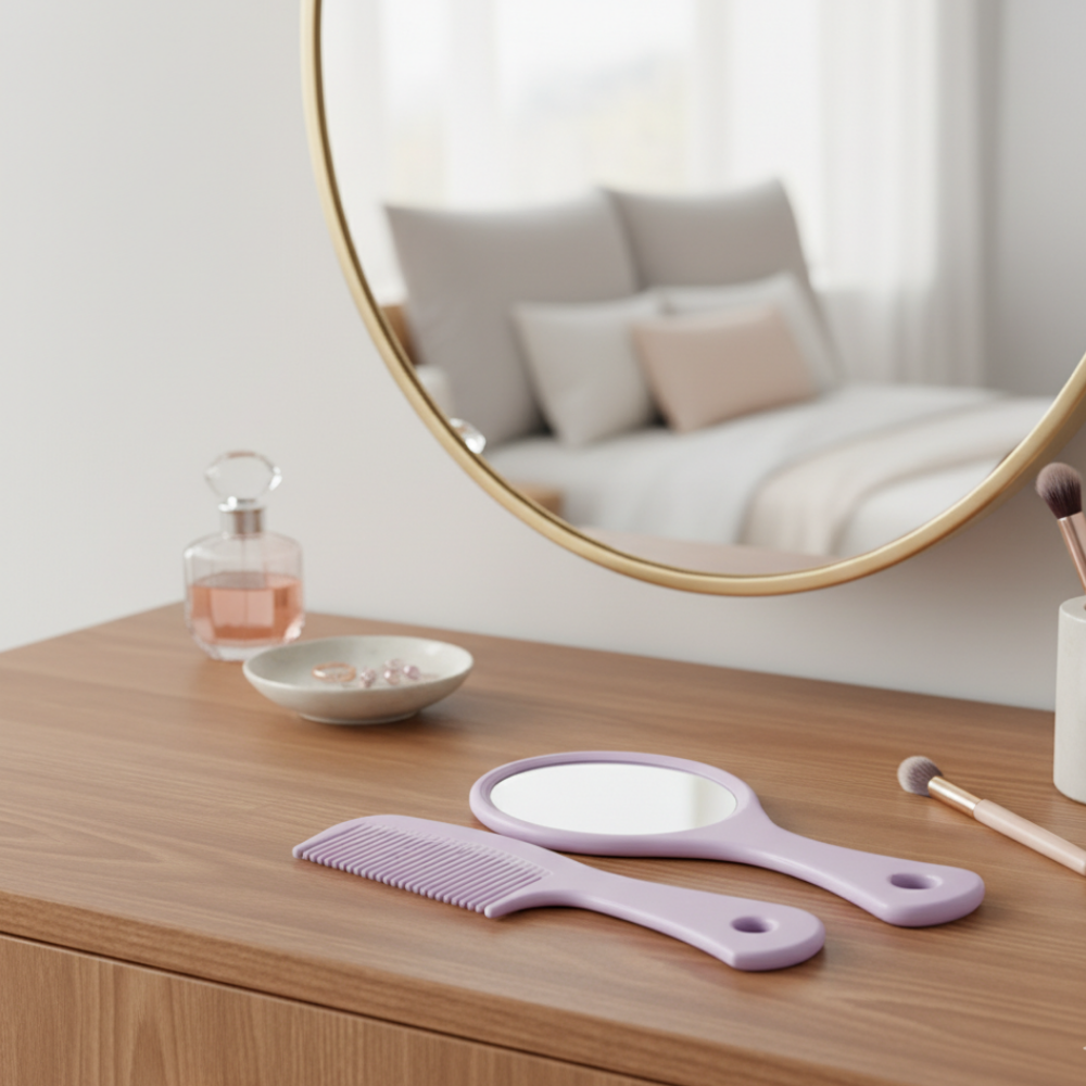 Práctico y compacto, este set de peine con espejo pequeño es ideal para el cuidado personal diario. Perfecto para llevar en la cartera, mochila o neceser, te permite retocar tu peinado en cualquier momento y lugar.