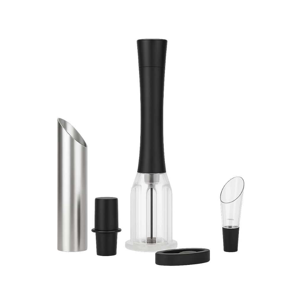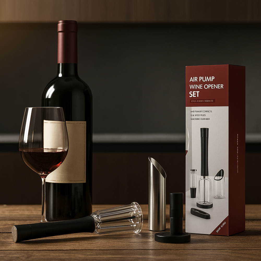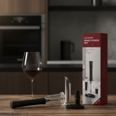 Disfruta de abrir tus botellas de vino de manera práctica y elegante con este moderno set de sacacorchos por presión de aire. Su diseño de cono con bomba infladora permite extraer el corcho sin esfuerzo y sin dañarlo. Ideal para amantes del vino y perfecto para reuniones, cenas o como regalo especial.