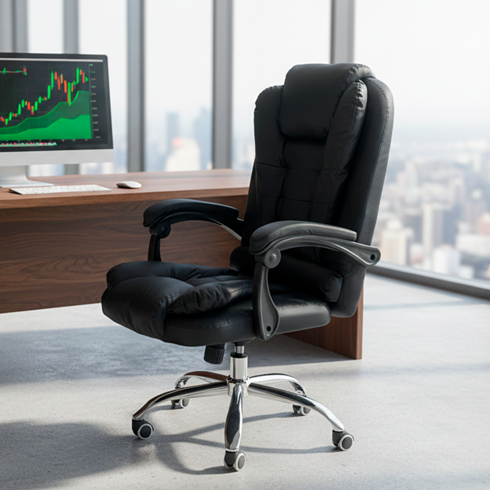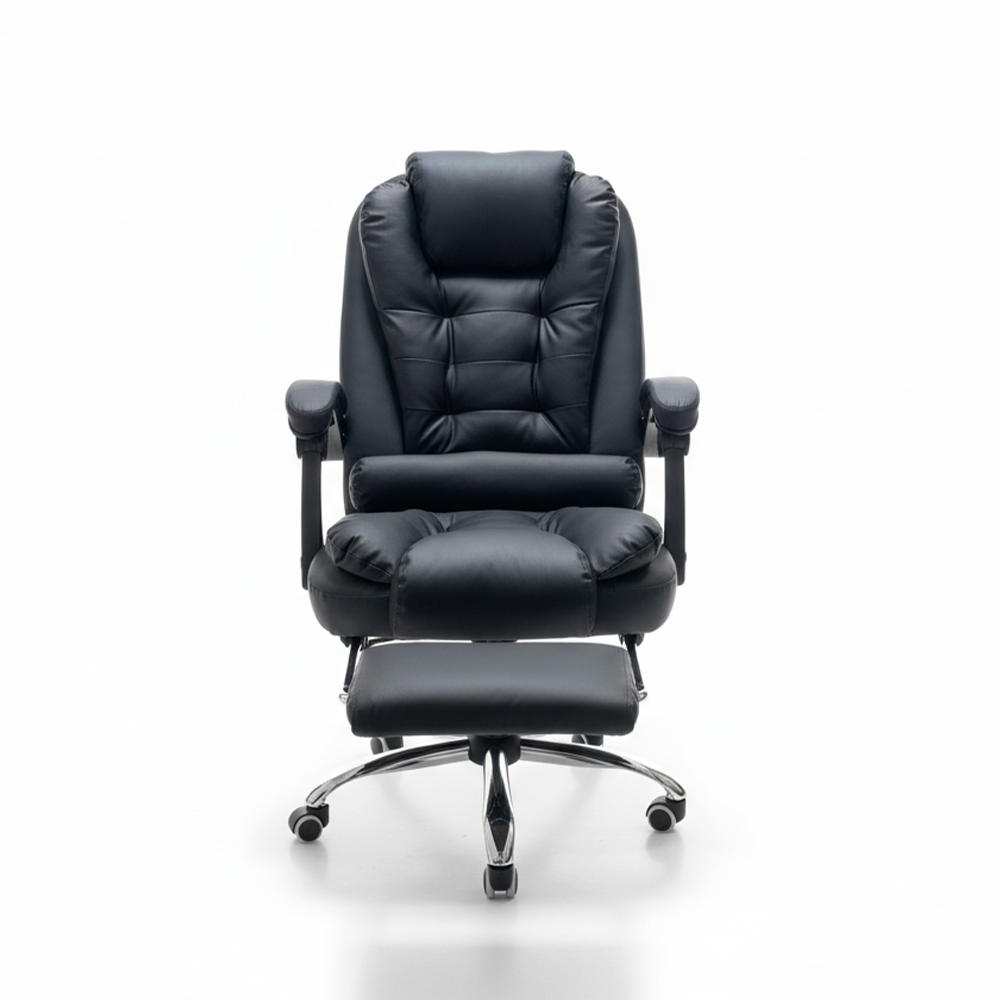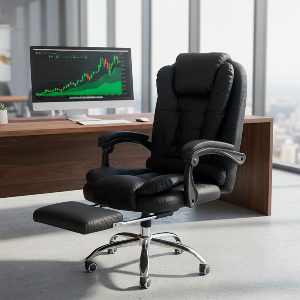 Trabaja o descansa con total comodidad gracias a la Silla Giratoria,diseñada para combinar ergonomía, estilo ejecutivo y un nivel superior de confort. Su reposapiés retráctil y su acolchado de lujo hacen de esta silla la opción ideal para largas jornadas en la oficina o en casa.