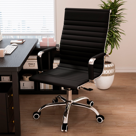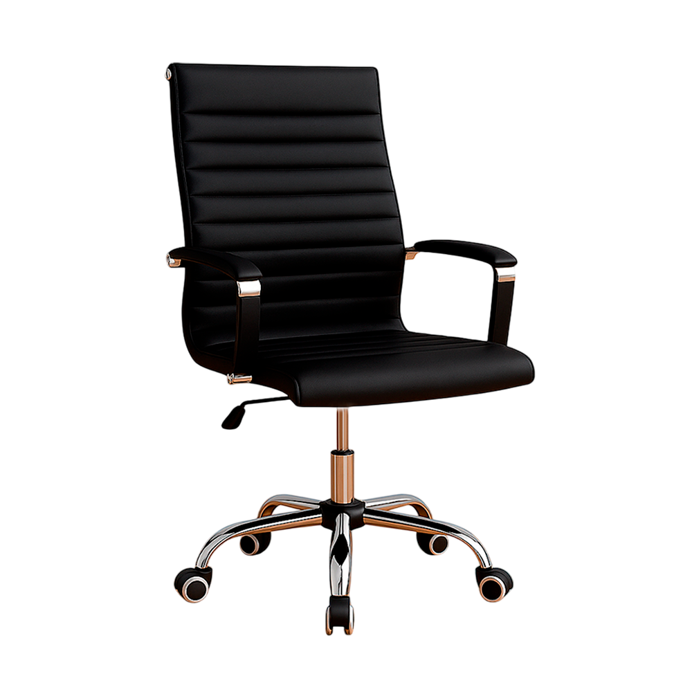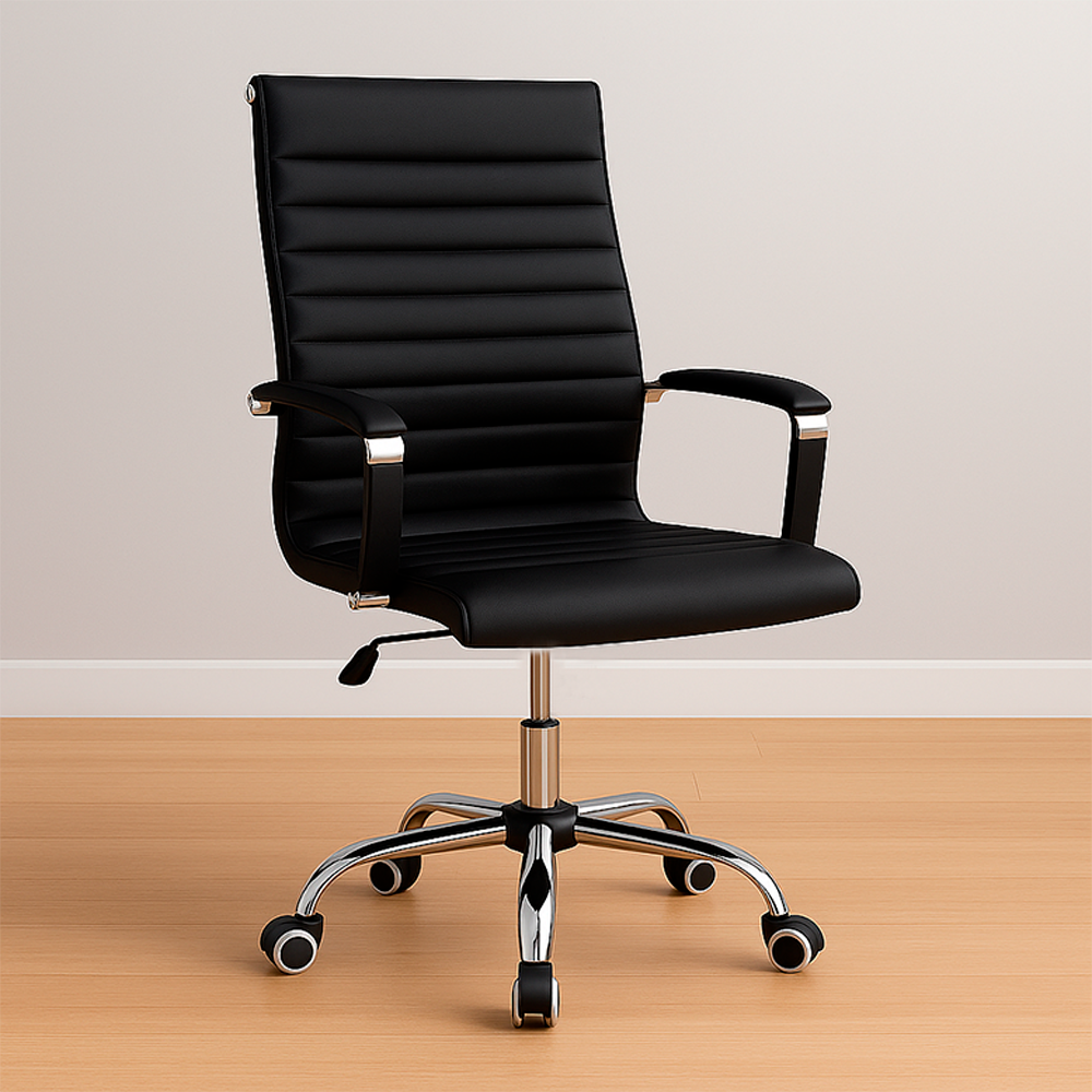 Silla ejecutiva ergonómica de diseño moderno, ideal para oficinas, escritorios y salas de reuniones. Su estructura con acabado cromado y tapizado en cuero sintético negro le otorgan un estilo elegante y profesional, adaptándose a cualquier ambiente de trabajo.