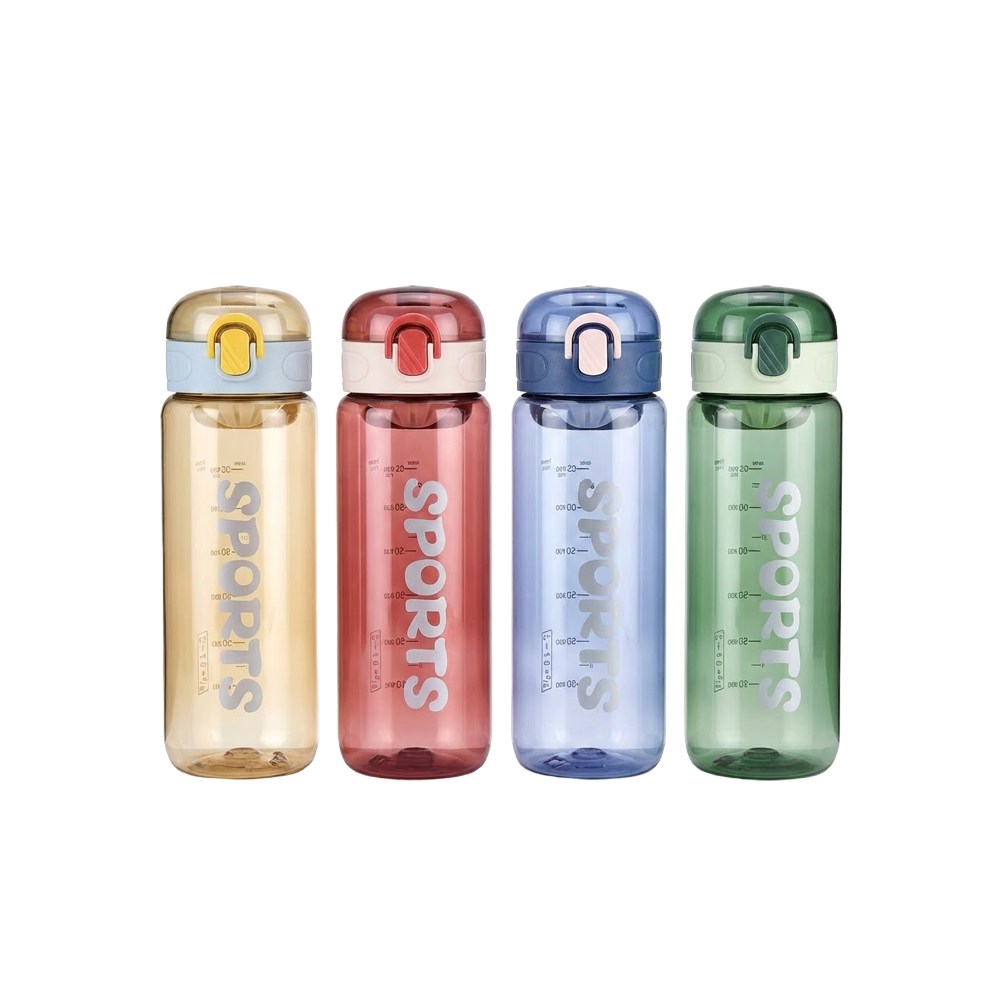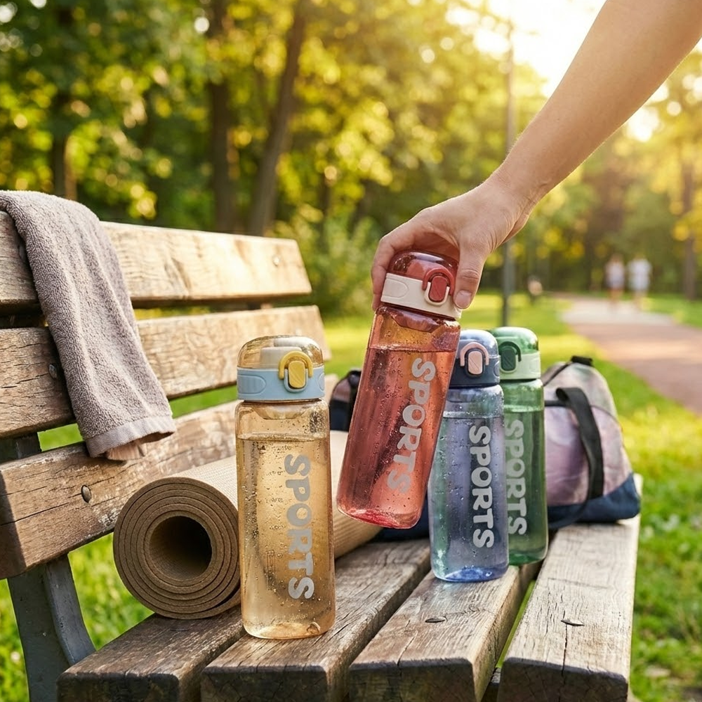 Nuestra botella deportiva "SPORTS" es la compañera perfecta para tus rutinas de ejercicio y aventuras al aire libre. Como se muestra en la imagen, su diseño robusto pero ligero la hace ideal para tenerla siempre a mano en el banquillo entre series, junto a tu esterilla de yoga o en tu bolsa de deporte después de una carrera por el parque.