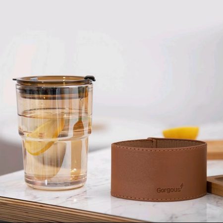 Eleva tu experiencia de bebida con el vaso con faja. Fabricado en vidrio resistente y con una elegante funda de piel sintética, es perfecto para tus bebidas favoritas, tanto frías como calientes. Incluye popote reutilizable para una opción más sostenible.